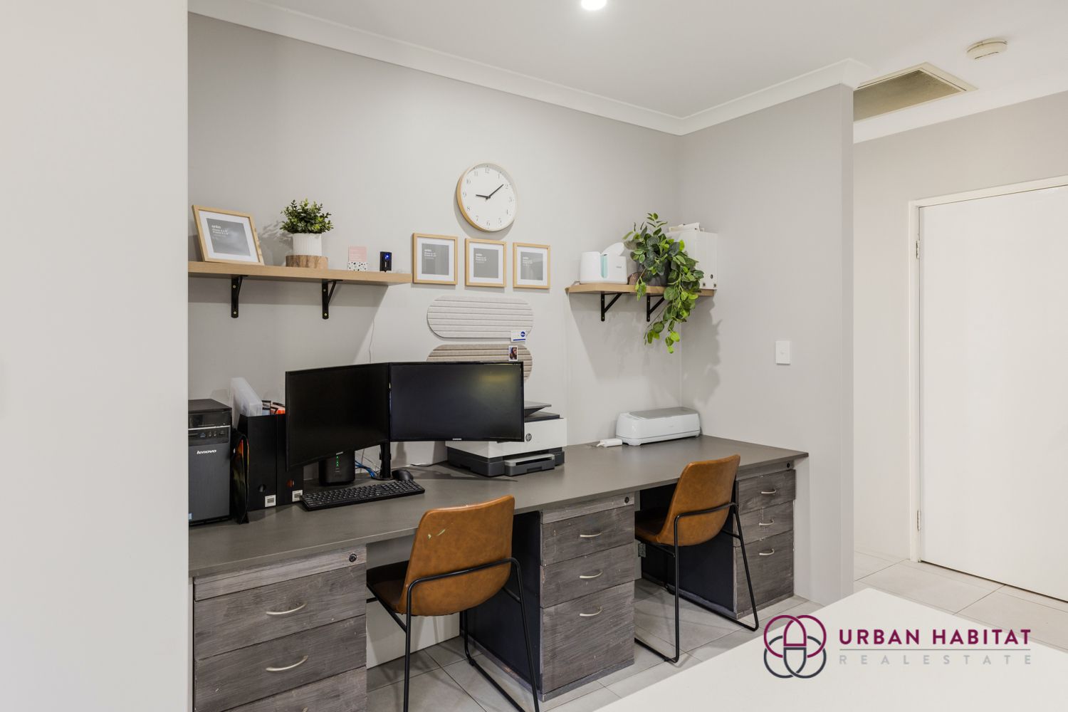 The expansive open-plan living and dining area is anchored by a stylish designer kitchen featuring generous bench space, quality appliances and abundant storage. A cleverly integrated study nook within the kitchen zone provides a dedicated workspace without disrupting the clean, modern aesthetic — ideal for professionals or growing families.