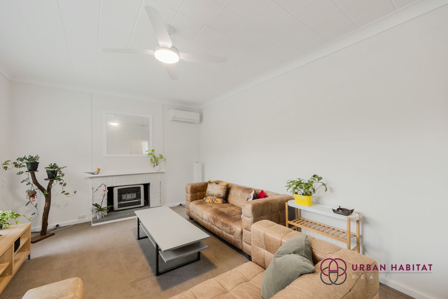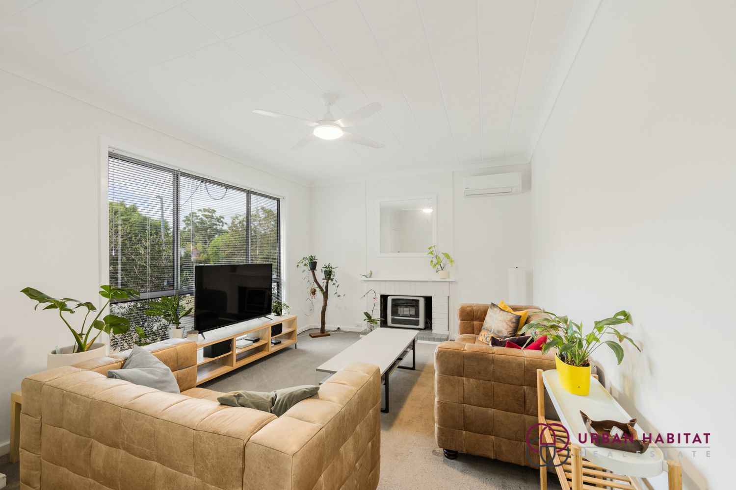 Inside, large windows, soft carpets, and a light, neutral colour palette create a sense of serenity and warmth throughout. The spacious bedrooms are positioned to one side of the home, serviced by a central bathroom, while the sunny front living room offers comfort year-round with a gas bayonet and split system air-conditioning.